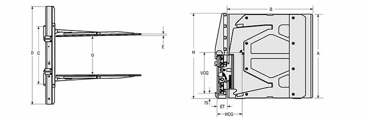 Capacity 承載能力(kg)Catalog Order NO 型號Mounting Class 安裝等級Load Center載荷中心(mm)Opening Range張臂范圍(mm)Arm Height臂高A(mm)Arm Length臂長B(mm)Arm Thickness臂厚E(mm)Overall Width總寬D(mm)Overall Height總高H(mm)Vertcial Center Of Gravity垂直重心VCG(mm)Hook Spread上鉤外側(cè)間距(mm)Weight 自重(kg)Effective 失載距ET(mm)Horizontal Center of Gravity 水平重心CGH(mm)