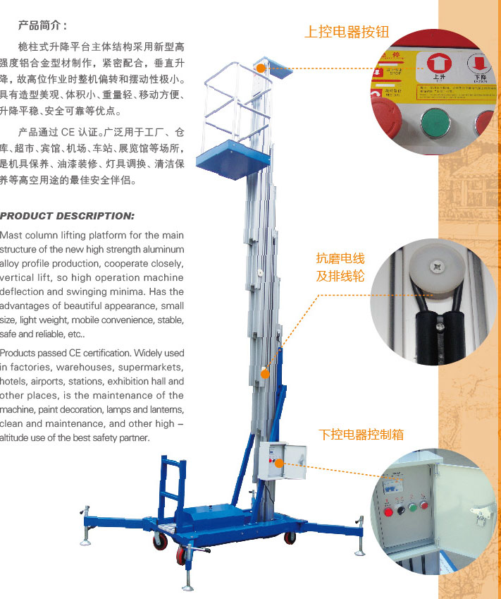 產品通過CE認證。廣泛應用于工廠、倉庫、超市、賓館、機場、車站、展覽等場所,是機具保養、油漆裝修、燈具調換、清潔保養等高空用途的最佳安全伴侶。
